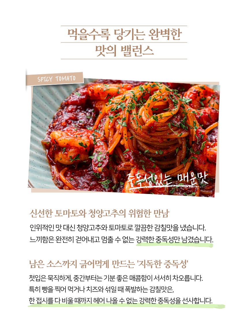 기존 토마토소스의 느끼함은 걷어내고 끝까지 깔끔하게 떨어집니다.