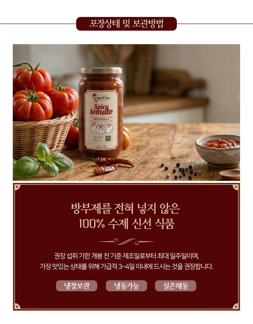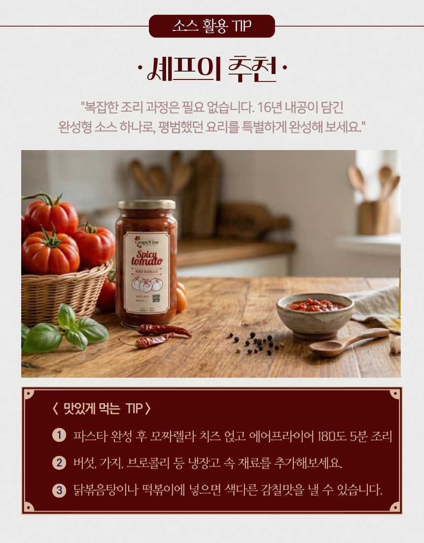 마법의 킥: 닭볶음탕이나 떡볶이 등 한식 요리에 소스를 곁들여 보세요. 청양고추와 토마토의 시너지가 익숙한 요리를 한층 더 고급스럽고 깔끔하게 끌어올려 줍니다.